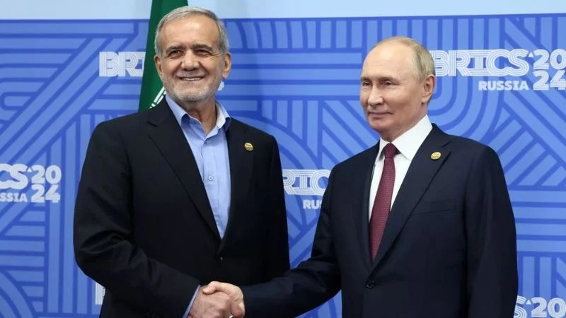 রাশিয়ার প্রেসিডেন্ট ভ্লাদিমির পুতিনের সঙ্গে ইরানের প্রেসিডেন্ট মাসুদ পেজেশকিয়ান। ফাইল ছবি: স্পুটনিক