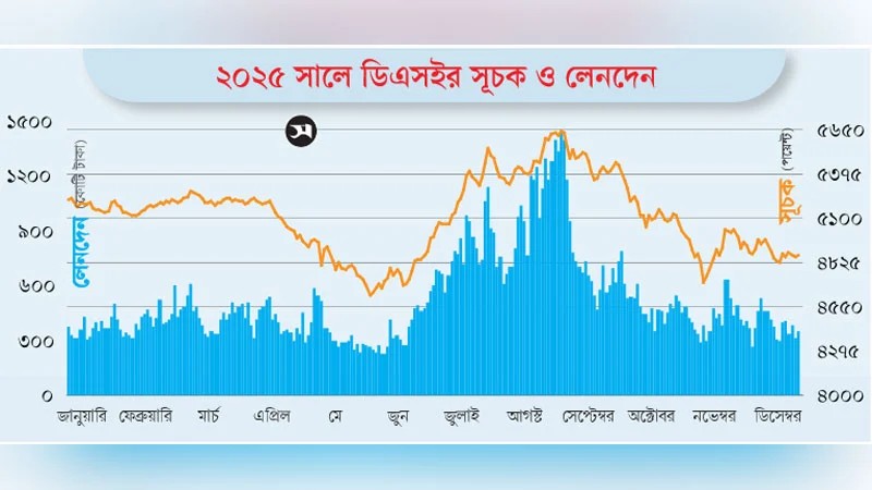 বিদায়ী ২০২৫ সালের প্রথম কর্মদিবসে দর হারিয়েছিল বেশির ভাগ শেয়ার। অবশ্য শেষ কর্মদিবসে এসে তুলনামূলক বেশি সংখ্যক শেয়ারের দর বেড়েছে। সূচকও বেড়েছে সামান্য, পৌনে ৪ পয়েন্ট। তবে পুরো বছরের হিসাবে সূচকের পতন হয়েছে ৩৫১ পয়েন্ট বা পৌনে ৭ শতাংশ। গতকাল মঙ্গলবার সূচকটির সমাপনী অবস্থান ছিল ৪৮৬৫ পয়েন্টে, বছরের শুরুতে যার যাত্রা শুরু হয়েছিল ৫২১৬ পয়েন্ট থেকে।