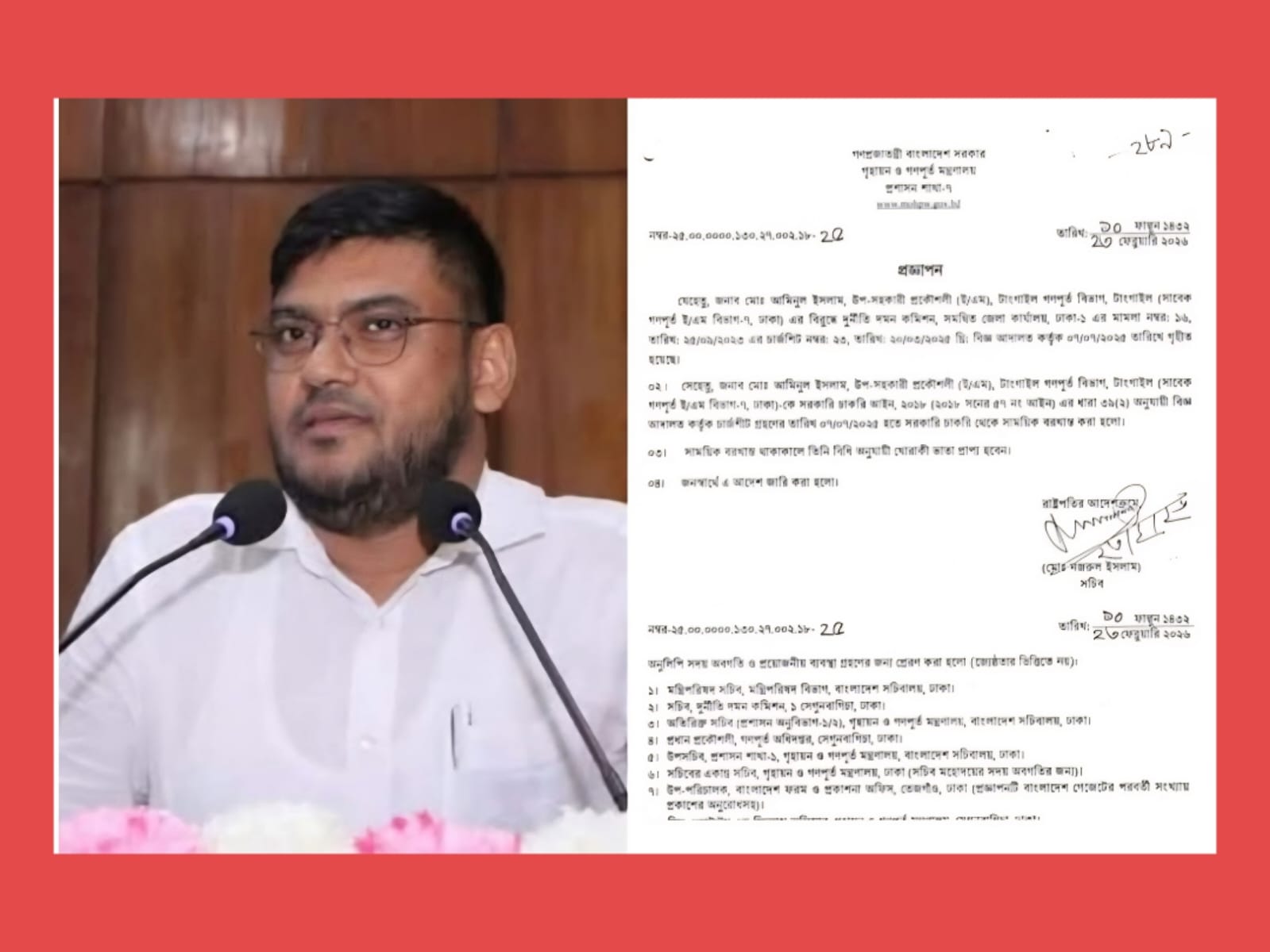২৩ ফেব্রুয়ারি ২০২৬ তারিখের প্রজ্ঞাপনে জানানো হয়, দুর্নীতি মামলায় আদালত চার্জশিট গ্রহণ করায় সরকারি চাকরি আইন, ২০১৮ এর ধারা ৩৯(২) অনুযায়ী তাকে বরখাস্ত করা হয়েছে।