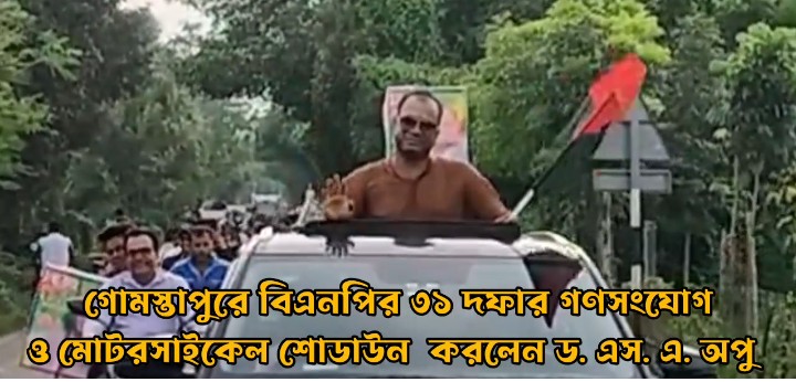 বিএনপির ৩১ দফা বাস্তবায়নে গনসংযোগ করেছেন চাঁপাইনবাবগঞ্জ-২ আসনের বিএনপির মনোনয়ন প্রত্যাশী বিশিষ্ট আইনজীবী ও সমাজ সেবক ড. এস এ অপু। শনিবার বিকেলে গোমস্তাপুর উপজেলার প্রত্যেকটা ইউনিয়নের বিভিন্ন এলাকায় গণসংযোগ ও মোটরসাইকেল শোডাউন করেন তিনি। বিভিন্ন হাট-বাজারে ঘুরে সাধারণ মানুষের সাথে কুশল বিনিময়, মতবিনিময় করে দলীয় কর্মীদের সাথে আলোচনায় অংশ নেন বিএনপির এই নেতা। এ সময় ডঃ এস এ অপু মানুষের সমস্যা ও সম্ভাবনার কথা শুনে এবং তাদের পাশে থেকে সমাধানের প্রতিশ্রতি দেন এবং দেশনায়ক তারেক রহমান কর্তৃক জাতির সামনে উপস্থিাপিত রাষ্ট্র কাঠামো মেরামতের ৩১ দফার সারমর্ম উপাস্থাপন করেন।