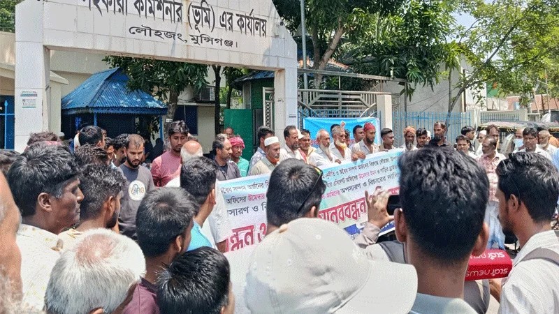 এর আগের দিন, মঙ্গলবার—ভোরের নরম আলো ফোটার আগেই জমে ওঠে মানুষের ভিড়। লৌহজং উপজেলা ভূমি অফিসের সামনে দাঁড়িয়ে তারা জানায় তাদের ক্ষোভ, তাদের হতাশা। মানববন্ধনের ব্যানারে লেখা ছিল অভিযোগের গল্প, চোখে ছিল ন্যায়ের আকুতি। ৭২ ঘণ্টার আল্টিমেটাম দিয়ে তারা দাবি তোলে—অপসারণ করতে হবে অভিযুক্তদের।