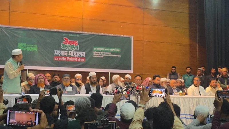 জামায়াতে ইসলামী, ইসলামী আন্দোলন, এনসিপিসহ ১১ দলের নির্বাচনী ঐক্যের একক প্রার্থী ঘোষণায় বৃহস্পতিবার রাতে রাজধানীর ডিপ্লোমা ইঞ্জিনিয়ার্স ইনস্টিটিউটে সংবাদ সম্মেলনে ডাকা হয়।