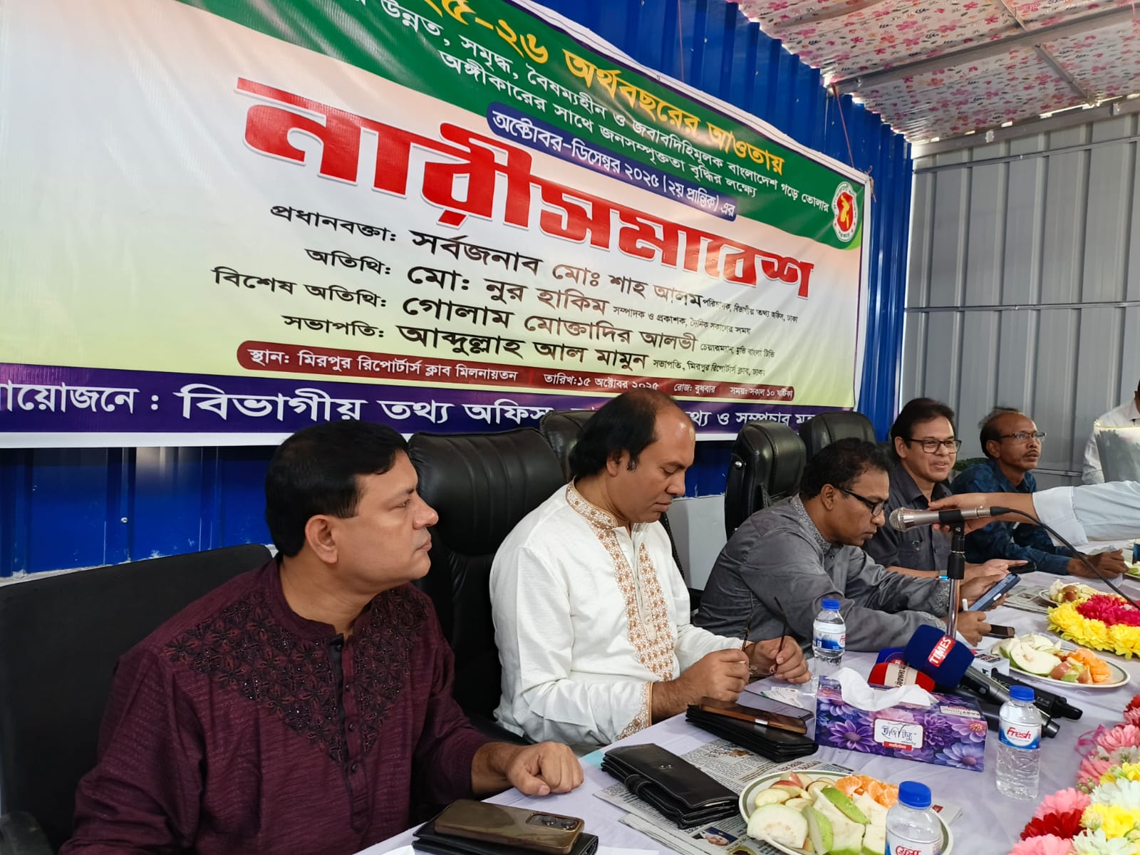 মিরপুর রিপোর্টার্স ক্লাবে তথ্য ও সম্প্রচার মন্ত্রনালয়ের আয়োজনে আজ ১৫ অক্টোবর ২০২৫ ইং তারিখে তারুণ্য নির্ভর উন্নত সমৃদ্ধ বাংলাদেশ বিনির্মাণে যৌতুক, বাল্যবিবাহ, ইভটিজিং, মাদকসহ বিভিন্ন বিষয়ের উপর সচেতনতামূলক নারী সমাবেশ অনুষ্ঠিত হয়। অনুষ্ঠানটি ভার্চুয়ালী উদ্বোধন করেন – তথ্য ও সম্প্রচার মন্ত্রনালয়ের মহাপরিচালক – মোঃ আব্দুল জলিল। অনুষ্ঠানে প্রধান বক্তা হিসেবে উপস্থিত ছিলেন জনাব, মোঃ শাহ আলম (বিসিএস তথ্য, উপসচিব পদমর্যাদার পরিচালক, তথ্য ও সম্প্রচার মন্ত্রণালয়)