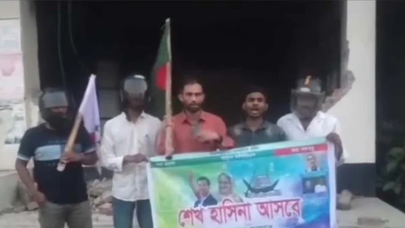 শুক্রবার সকালের মৃদু আলোয়, পৌরসভা মোড়ের সেই পরিচিত কিন্তু আজ পরিত্যক্ত ভবনের সামনে জড়ো হন তারা। ভিডিওতে দেখা যায়—পাঁচজনের ছোট একটি দল, নেতৃত্বে পৌর ছাত্রলীগের সাংগঠনিক সম্পাদক ইমদাদুল হক সজল। কারও মাথায় হেলমেট, কারও হাতে জাতীয় পতাকা, কারও হাতে দলীয় পতাকা—এক অদ্ভুত প্রতীকী দৃশ্য, যেন ধ্বংসের বুক চিরে পুনর্জাগরণের ঘোষণা।
