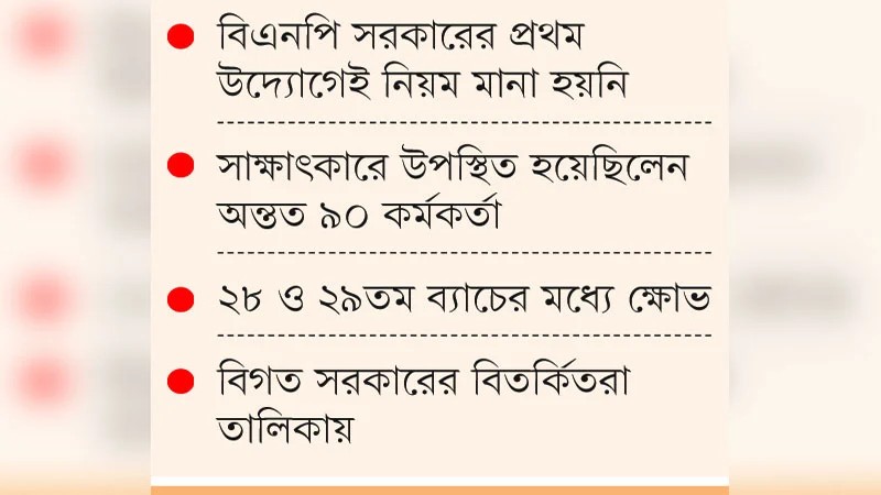 জনপ্রশাসন মন্ত্রণালয়ের সূত্র জানায়, অতীতে আওয়ামী লীগ ও অন্তর্বর্তী সরকারের সময় মেধাতালিকার ক্রম অনুসারে সব কর্মকর্তাকে সাক্ষাৎকারের জন্য ডাকা হতো। কেউ কেউ ব্যক্তিগত কারণে অনুপস্থিত থাকলেও ডাকার ক্ষেত্রে বৈষম্যের অভিযোগ ছিল না।