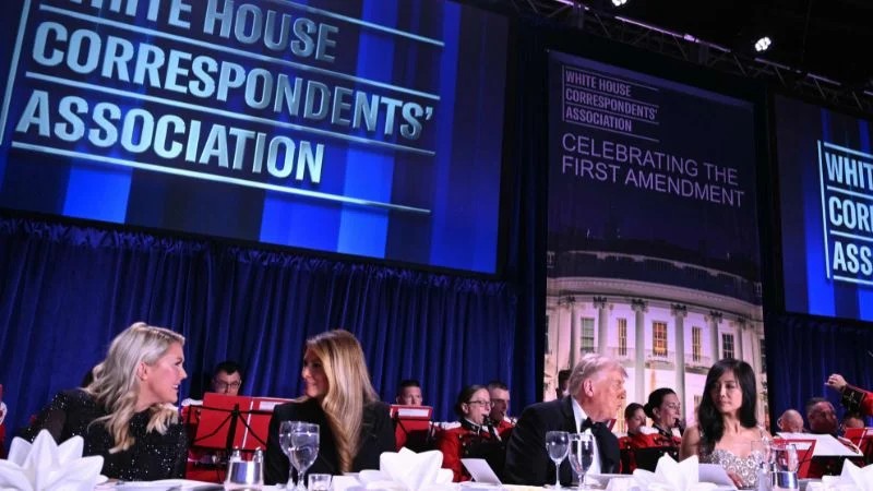 হোয়াইট হাউস করেসপনডেন্টসের নৈশভোজে অতিথিদের সঙ্গে ডোনাল্ড ট্রাম্প। শনিবার ওয়াশিংটন ডিসিতে। ছবি: এএফপি