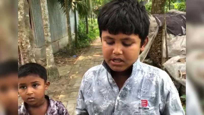 সংবাদকর্মীদের সঙ্গে কথা বলছে ৭ বছরের নিশান মণ্ডল। পাশে ছোট ভাই সৃজন। সোমবার কাশিয়ানীর সিঙ্গা গ্রামে। ছবি: সংগৃহীত