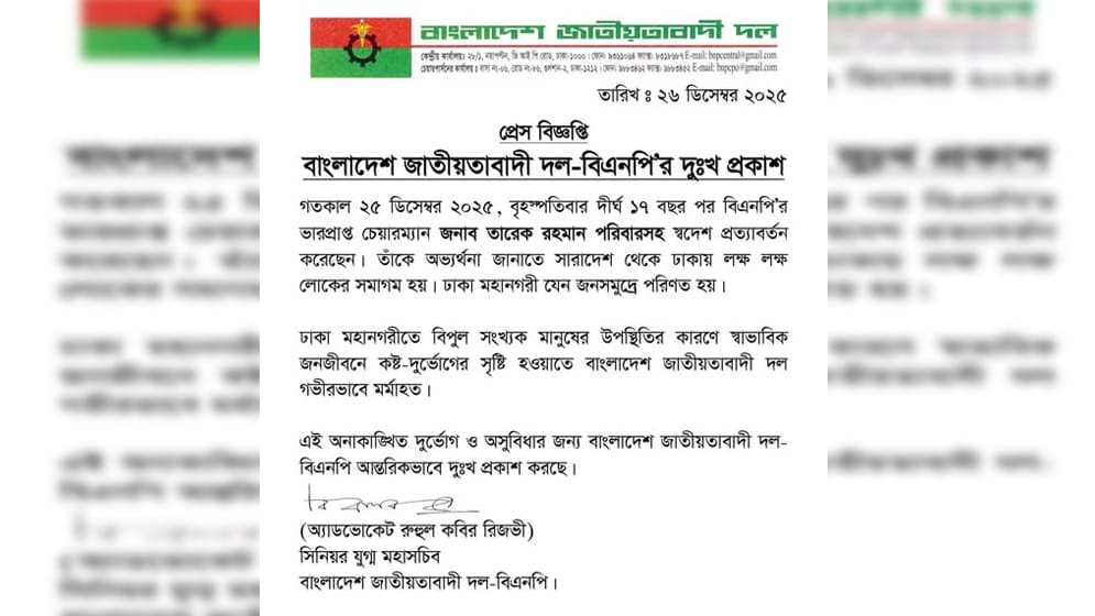 এতে বলা হয়, গতকাল বৃহস্পতিবার (২৫ ডিসেম্বর) দীর্ঘ ১৭ বছর পর বিএনপির ভারপ্রাপ্ত চেয়ারম্যান তারেক রহমান পরিবারসহ স্বদেশ প্রত্যাবর্তন করেছেন। তাকে অভ্যর্থনা জানাতে সারা দেশ থেকে ঢাকায় লাখ লাখ লোকের সমাগম হয়। ঢাকা মহানগরী যেন জনসমুদ্রে পরিণত হয়। ঢাকা মহানগরীতে বিপুল সংখ্যক মানুষের উপস্থিতির কারণে স্বাভাবিক জনজীবনে কষ্ট-দুর্ভোগের সৃষ্টি হওয়াতে বাংলাদেশ জাতীয়তাবাদী দল গভীরভাবে মর্মাহত। এ অনাকাঙ্ক্ষিত দুর্ভোগ ও অসুবিধার জন্য বাংলাদেশ জাতীয়তাবাদী দল আন্তরিকভাবে দুঃখ প্রকাশ করছে।