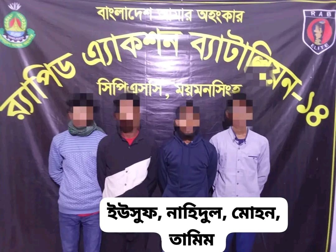 ময়মনসিংহ র‍্যাব ১৪ চেকপোস্টে পরিবহন গাড়িতে অভিযানে গাজাসহ ৪ মাদক কারবারি গ্রেফতার