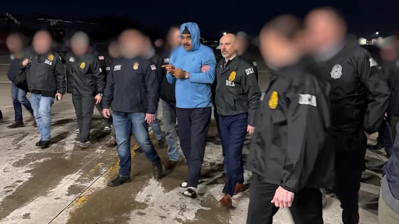 মার্কিন অভিযানে গ্রেপ্তার নিকোলাস মাদুরোর সঙ্গে যুক্তরাষ্ট্রের ড্রাগ এনফোর্সমেন্ট অ্যাডমিনিস্ট্রেশনের সদস্যরা। ছবি: এবিসি নিউজের সৌজন্যে