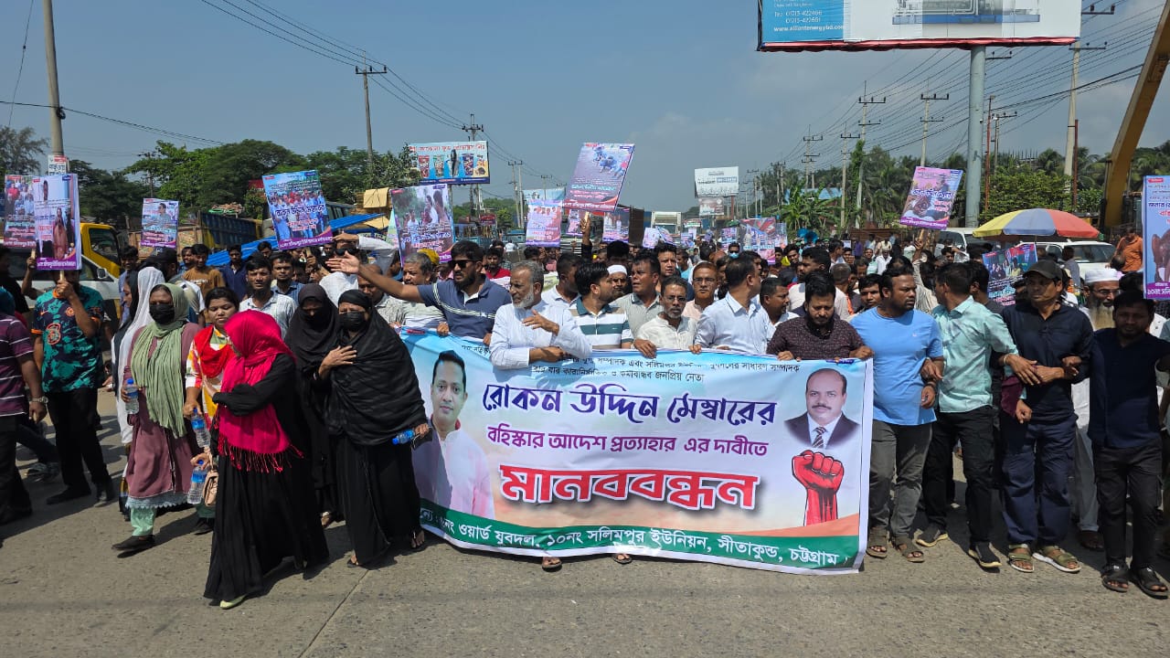 সীতাকুণ্ডের ১০ নং সলিমপুর ইউনিয়নের জনপ্রিয় রোকন উদ্দিন মেম্বারের দলীয় পদ বহিস্কারাদেশ প্রত্যাহারের দাবীতে মানববন্ধন করেছে সলিমপুরের নারী,পুরুষ,কিশোর,যুবক।