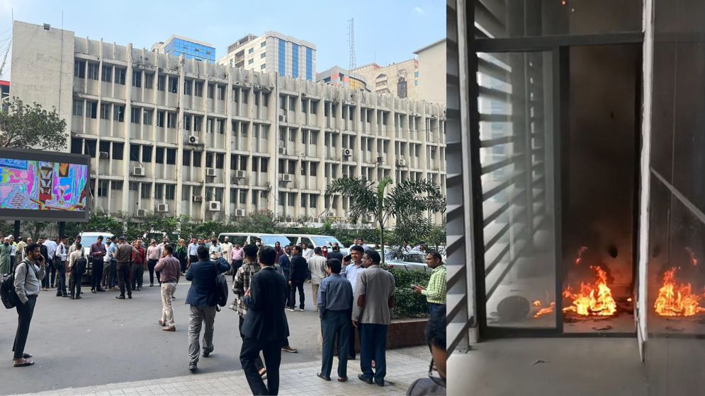 রাফিউল ইসলাম নামের এক কর্মকর্তা বলেন, হঠাৎ করেই ফায়ার হুইসেল বাজতে শুরু করে। কয়েক মিনিটের মধ্যে আমরা ১০ তলার দিক থেকে ধোঁয়া উঠতে দেখেছি। পরিস্থিতি বুঝে সঙ্গে সঙ্গে নিচে নেমে আসি।