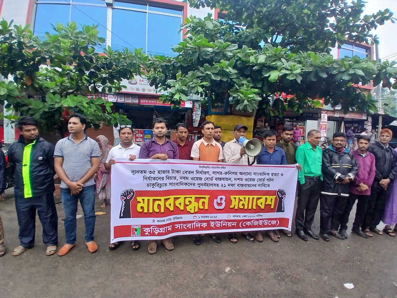 ন্যূনতম ৩৫ হাজার টাকা বেতন নির্ধারণ, সাগর-রুনি হত্যার বিচার, নবম ওয়েজ বোর্ড বাস্তবায়ন ও দশম ওয়েজ বোর্ড গঠন, চাকরিচ্যুত সাংবাদিকদের পুনর্বহালসহ ২১ দফা দাবি বাস্তবায়নের দাবিতে কুড়িগ্রামে মানববন্ধন ও সমাবেশ অনুষ্ঠিত হয়েছে।