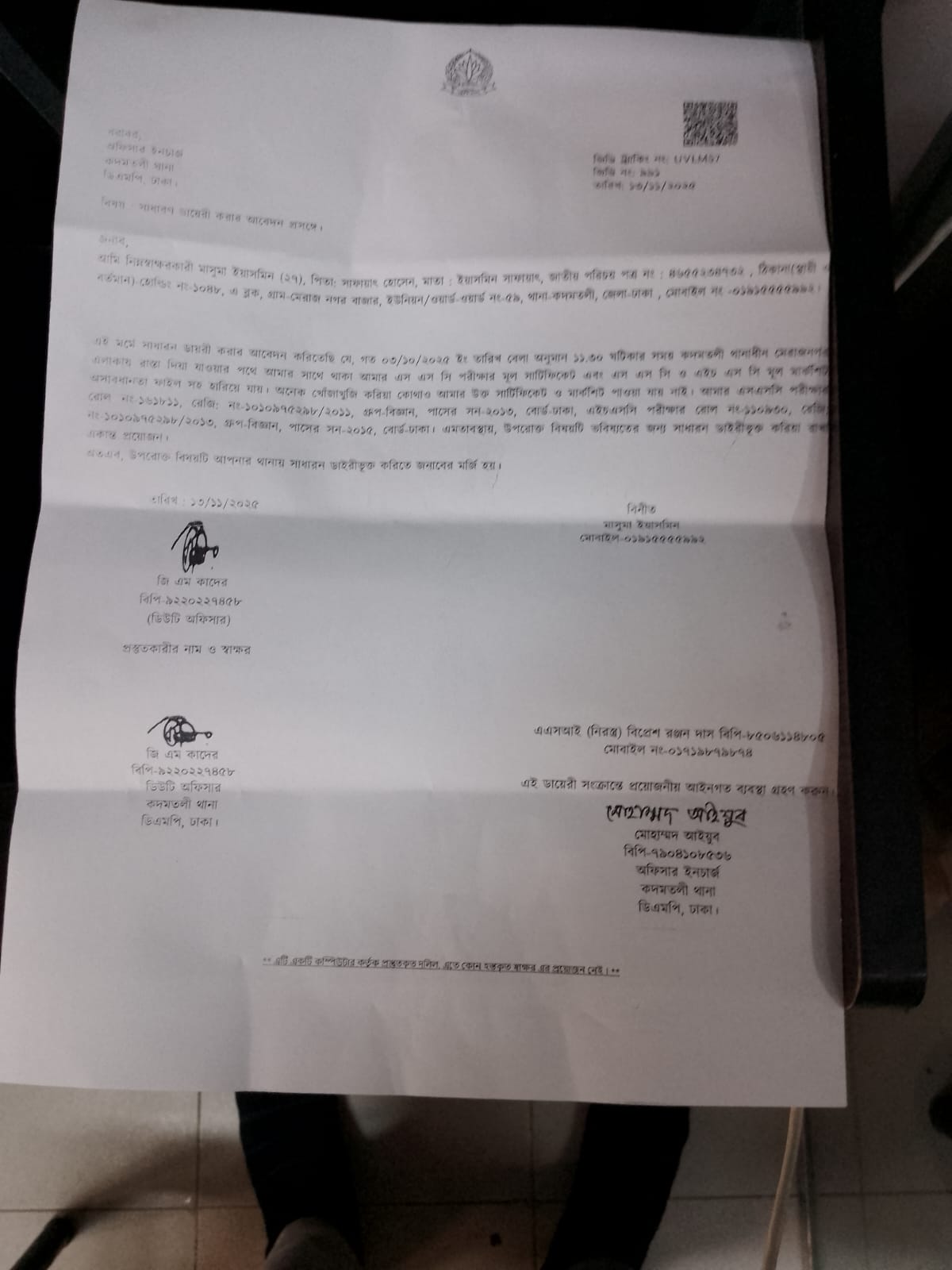 উল্লিখিত সনদপত্রসমূহ কোনো সহৃদয় ব্যক্তি পেয়ে থাকলে নিকটস্থ থানায় জমা দেওয়া অথবা সংশ্লিষ্ট ঠিকানায় যোগাযোগ করার জন্য বিশেষভাবে অনুরোধ জানানো হলো।