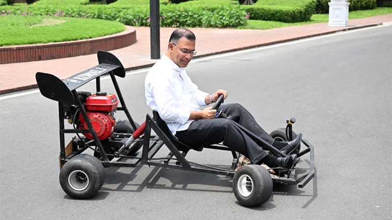 কলেজছাত্র রিজওয়ান রশীদের বানানো গো-কার্ট (রেসিং কার) চালিয়ে তাকে উৎসাহ দিয়েছেন প্রধানমন্ত্রী তারেক রহমান। ছবি: পিএমও
